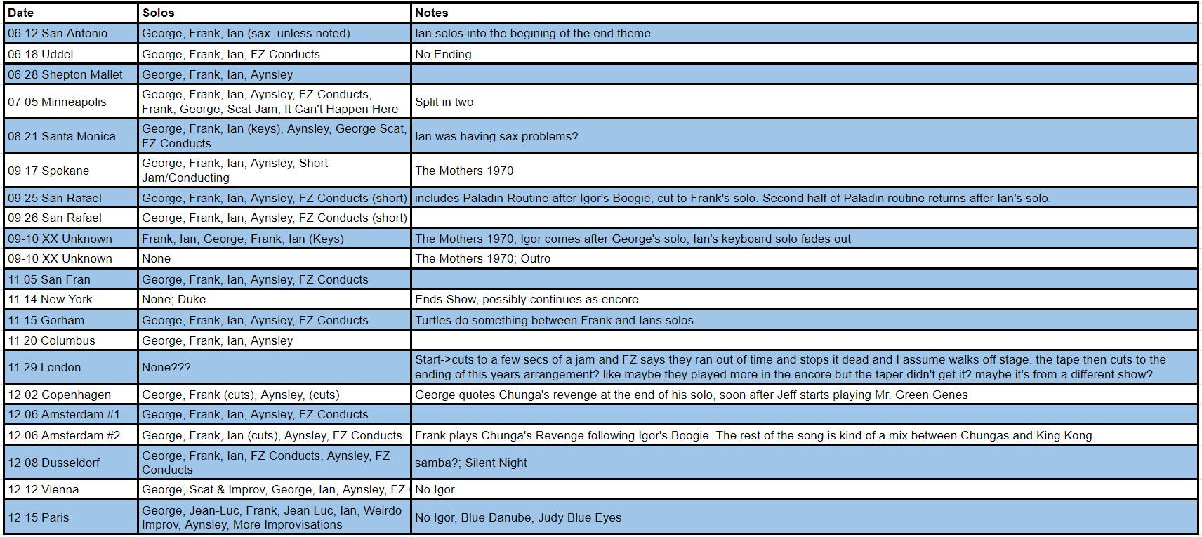 King Kong – The beast continues to change up a bit on this tour. The theme starts as normal and is then immediately followed by a new, short, third theme of King Kong . George Duke always takes the first solo and blows us all away. Then the secondary theme comes in, before fading away into a very mellow, tweaky take of part one of Igor’s Boogie! It’s played twice before a new fourth theme to King Kong is introduced! This fourth theme is also a variation on the beginning phrase of Igor’s Boogie. Following the boogie things start to get more experimental. At most shows following the third theme, Ian gives a fantastic sax solo, Frank follows with a tremendous guitar workout, Aynsley gives a monster drum solo and Frank conducts some weirdness into the final repetitions of the main theme. After the very last repetition there’s a slow, meltdown-y, ending. This, of course, isn’t what always happened. At the Minneapolis early show, the tune ends after George’s solo, but starts up where it left off about half an hour and 8 songs later. Occasionally just the first and second themes of King Kong would get played and Frank would announce the end of the concert, neat to hear but it rarely occurs. On two of the three known occurrences of this outro version, it’s likely they continue the song as an encore. At the first Pepperland show Frank experimented with inserting The Paladin Routine in between the solos. Really weird hybrid creation, but super neat to hear. At the last two performances from this tour, the whole Igor’s Boogie section was dropped. Starting in August this tune was almost always preceded by You Didn’t Try to Call Me as the end to what I’ll call the oldies medley. In November, George starts playing a line from Call to Post in the final outro. At a few shows in Europe the band would quote Chunga’s Revenge, and at the late Amsterdam show Frank plays the whole intro following the Igor’s Boogie section. At the Paris show, Jean-Luc Ponty guests in King Kong and fantastic things happen, including quotes from Ain’t She Sweet?, Blue Danube, and Suite: Judy Blue Eyes. Every performance, except the outro takes, are incredibly inspired and hot and a main reason to collect tapes from this tour.