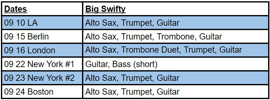 New Brown Clouds – Part four of Greggery Peccary was often played on it’s own, separate from the other movements. At the first two shows it was played as an opener, with the rest of the suite late in the program. The two following performances (London and Boston) feature the complete piece. Only the first New York show has New Brown Clouds with no Greggery Peccary. The orchestra always performs an excellent instrumental take of the ending movement. Every performance featured a short clarinet or sax solo before the quotation from One Shot Deal, and a short trombone solo after.