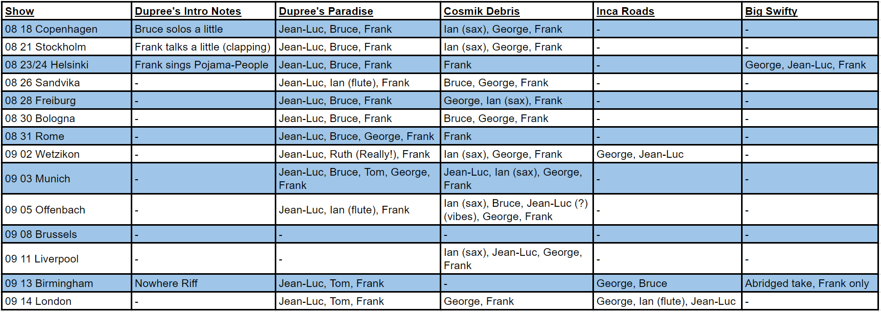 Improvisations/Jams – Frank and the gang “make something up” at four dates on this tour: Helsinki, Wetzikon, Brussels and Birmingham. Each performance has a unique vibe and set of solos. Ian starts off the Helsinki improv and makes it very tweaky, but Frank ends up lecturing the audience about a horror movie sound cue (DUNT-DUN-DUN!) To bring the night to a close. The Wetzikon improvisations starts with Tom and ends with some great guitar demolition from Frank (reminds me of the Scranton 71 Billy the Mountain). Frank dubs the Brussels performance “Music for Broken Drum and Stella Artois”, because of a running joke at the show and because Ralph’s getting his drum fixed at the beginning of it. This take starts off real weird with percussion and synths, before eventually delving into a jam. The Birmingham improvisations are interesting because they contain a number of quotes from various Frank Zappa compositions. Overall this is a great tour for improv, despite only popping up at a handful of dates.