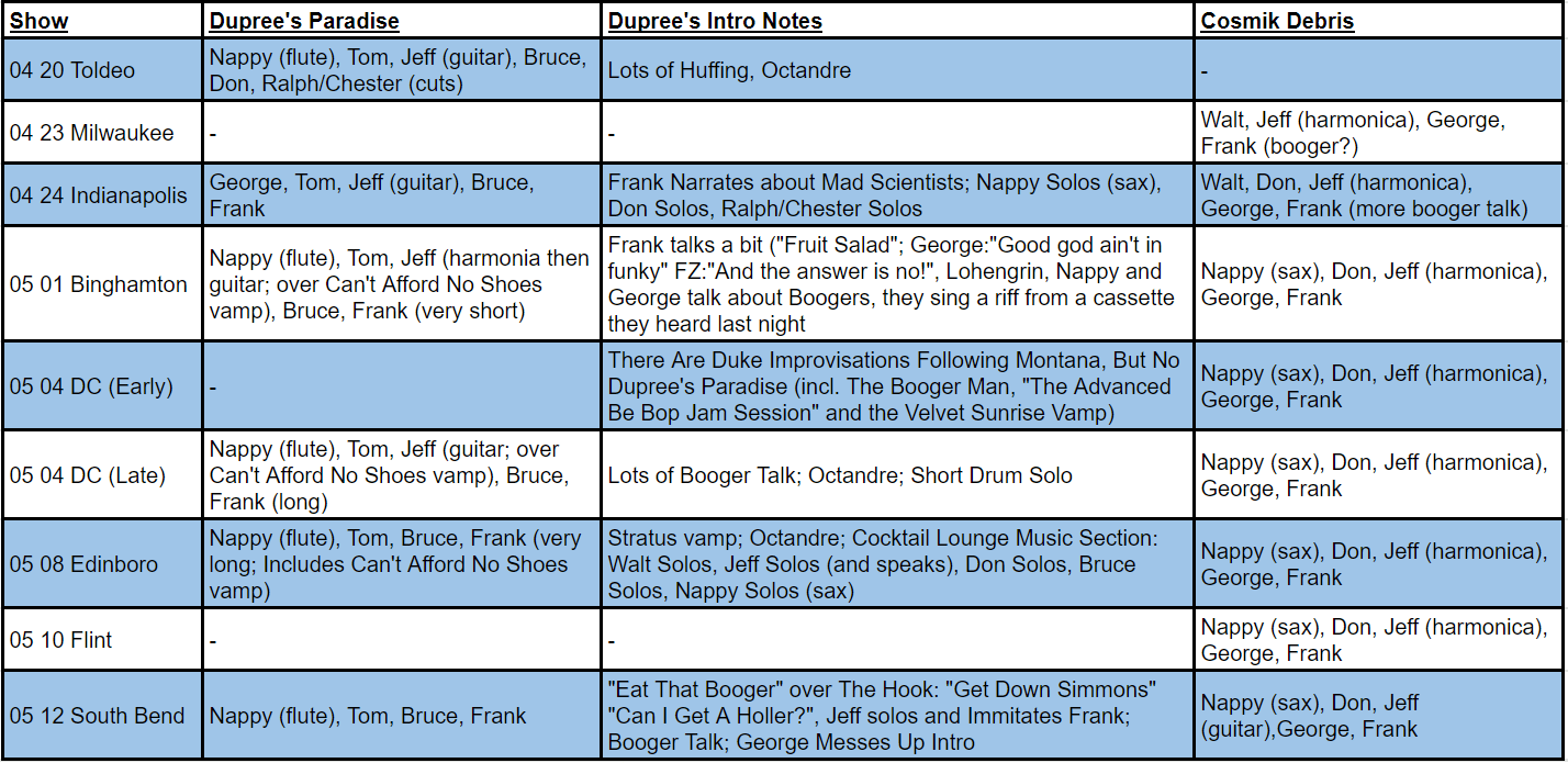 Improvisations – There is one occurrence of true free improv on this tour, it happens at the DC late show after the drum battle in Don’t You Ever Wash That Thing. Frank begins to conduct some tweaky bass and synth improv that pretty quickly turns into a Q&A where Frank asks each of his musicians what their astrological sign is and where they get their clothes. It morphs into a jam for a little while until Frank begins to sing Cosmik Debris. The tape’s pretty bad so you can’t make out much, but it’s amusing nonetheless. Also, at the DC early show, there are George Duke based improvisations after Montana, but they don’t go into the theme of Dupree’s Paradise (These improvisations are sometimes known as The Booger Man). After this they go into “The Advanced Be Bop Jam Session”, which is Giant Steps, Little Coquette, Sweet Leilani and Ornithology played on top of each other over vamp from The Velvet Sunrise (an unreleased song).