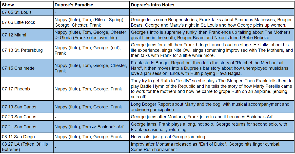 Improvisations/Jams/Blues – This is a solid tour for free improv for the Mothers of Invention. Tom starts off their earliest attempt to “make something up”, which they do in spades for over 20 minutes on the first recording of the tour in St. Louis and there’s some tweaky keyboard-lead improv in Final San Carlos show aptly titled “Special Amplifier-Fixing Music”. Frank has a desire to play the blues late in the tour, and does so in Phoenix and San Diego. He even sings a bit of Road Ladies over the jam in Phoenix. Beyond total free improv, there are fantastic loose jams in Dupree’s Paradise (both the intro and the main tune, with the intro sometimes referred to as “Improvisations” “Duke Improvisations” or “The Booger Man”) and surprisingly in the two performances of Gloria. And just cause I have nowhere else to mention this, Frank offhand plays the San Ber’dino riff and the Eat That Question riff between songs in Miami.