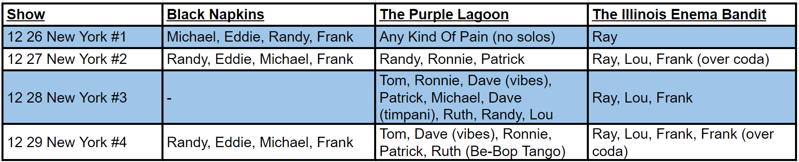 The Illinois Enema Bandit – The Enema Bandit returns once again, this time to terrorize New York. We get basically what’s on ZINY, but with a couple more solos. The released performance is from the final show, but Frank chose to edit out Ray and Lou’s solos before his own. They aren’t the most amazing solos, but they’re really fun to hear. This tune changed a little bit every night; The first performance only had a solo from Ray, the second had a solo from Ray and Lou in the middle, with some guitar action from Frank over the vocal coda. On the 28th and 29th we get tasty solos from all three contestants in the middle of the tune, and Frank plays over the ending once again during the final show. Generally we don’t get any horn stings/riffs over the solos, but there’s some over Frank’s solo on the 27th (mimicking “it must be just…”), and some classic blues riffs over Ray’s solo on the 28th.The vocal ending always goes a little crazy, but the released version on the 29th with the It Can’t Happen Here quote is by far the craziest. Overall this is a great run for this tune, Ray knocks the vocals out of the park, the soloists all deliver, and we get a high quality Enema Bandit experience.