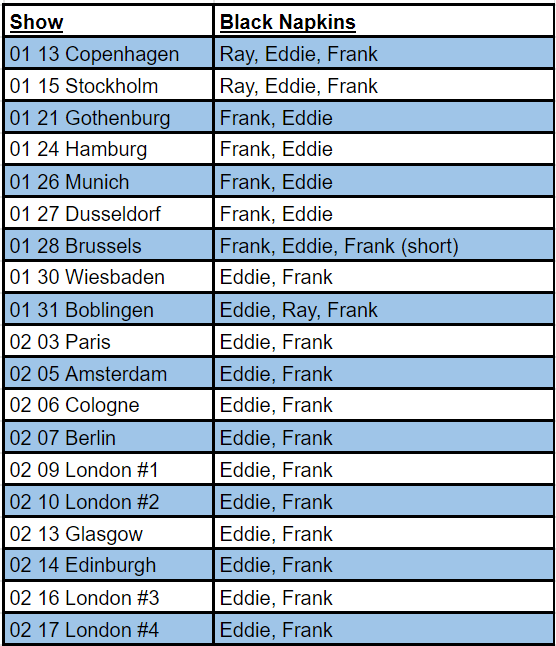 Black Napkins – This Zappa classic is in top form on this tour. The theme is wonderfully orchestrated and performed, and each soloist provides a beautiful and unique layer to the tune. The earliest two recordings we have have the same solo structure as the Black Napkin’s from the end of their previous North American tour: Ray>Eddie (on violin)>FZ, but soon after the tour begins Frank drops Ray from the tune (though Ray does solo in Black Napkins one more time in Boeblingen, for no easily discernible reason). For the rest of the tour we get two fantastic solos from Frank and Eddie in each performance, but the order varies depending on the phase of the tour. Frank goes first from January 21st through the 28th, but it’s clear that Eddie’s second solo was verging on trumping Frank’s own (it definitely bugs Frank on the 28th in Brussels, because he plays a second shorter solo after Eddies to wrap up the tune. Wiesbaden is the first show with the Eddie-then-Frank order, and this becomes the norm in February. Additionally, Frank would really play around with the composed head of this piece, and would pretty much always play a shorter pseudo-solo as the theme ends, but before the improv section truly begins. No matter the solo order, Eddie and Frank play their hearts out in every performance, and create two fantastic musical moments. It really feels like we have two fantastic musicians battling for who can create the most terrific, emotional event, and it’s almost always arguable who wins. Eddie’s violin is simply beautiful, and Frank’s guitar is equally ferocious. This is arguably the best tour for Black Napkins, and the song is an easy highlight of every show. It’s a fantastic display of what this band should do, and any fan of FZ’s instrumental music should check one of these out.